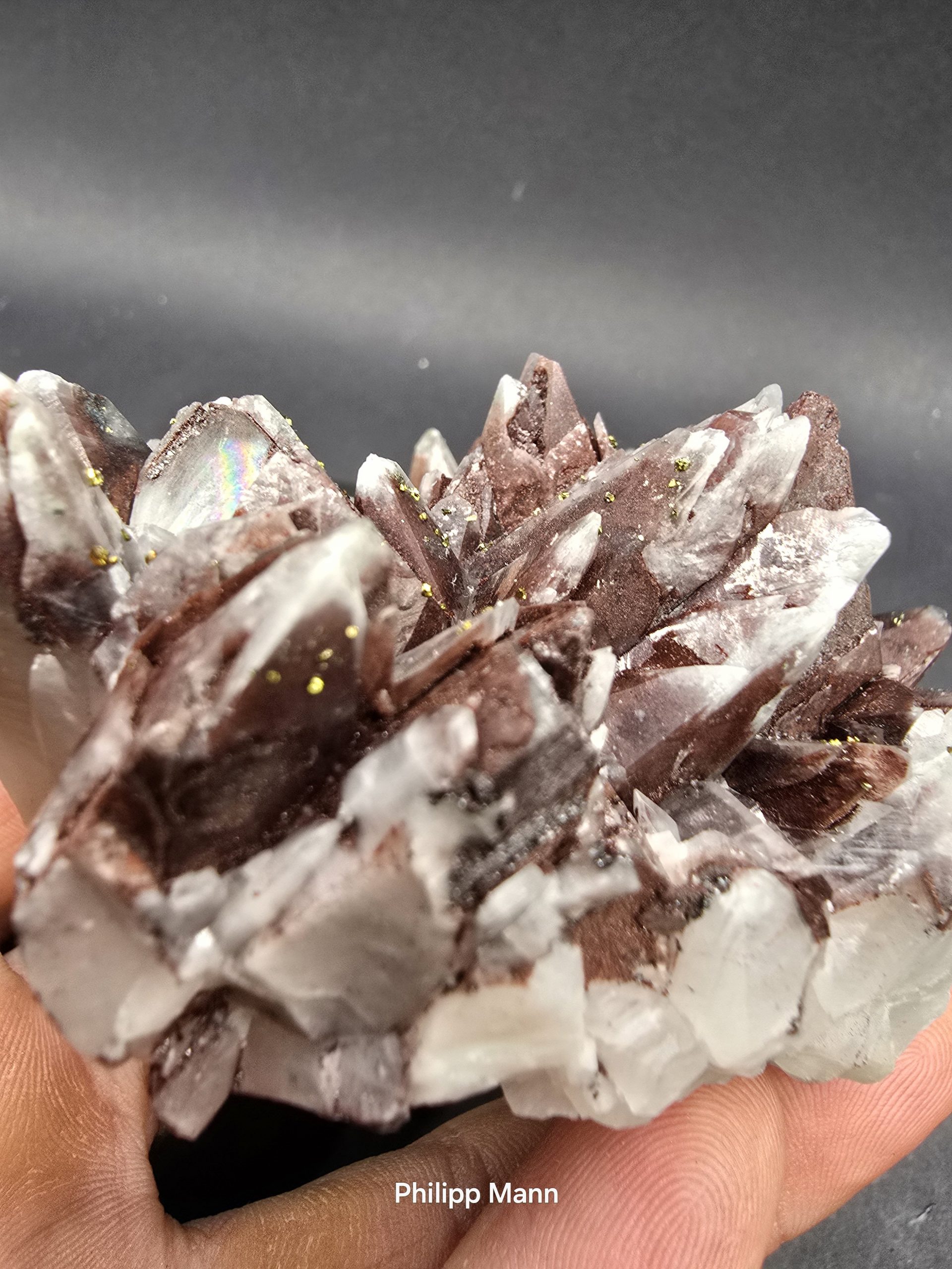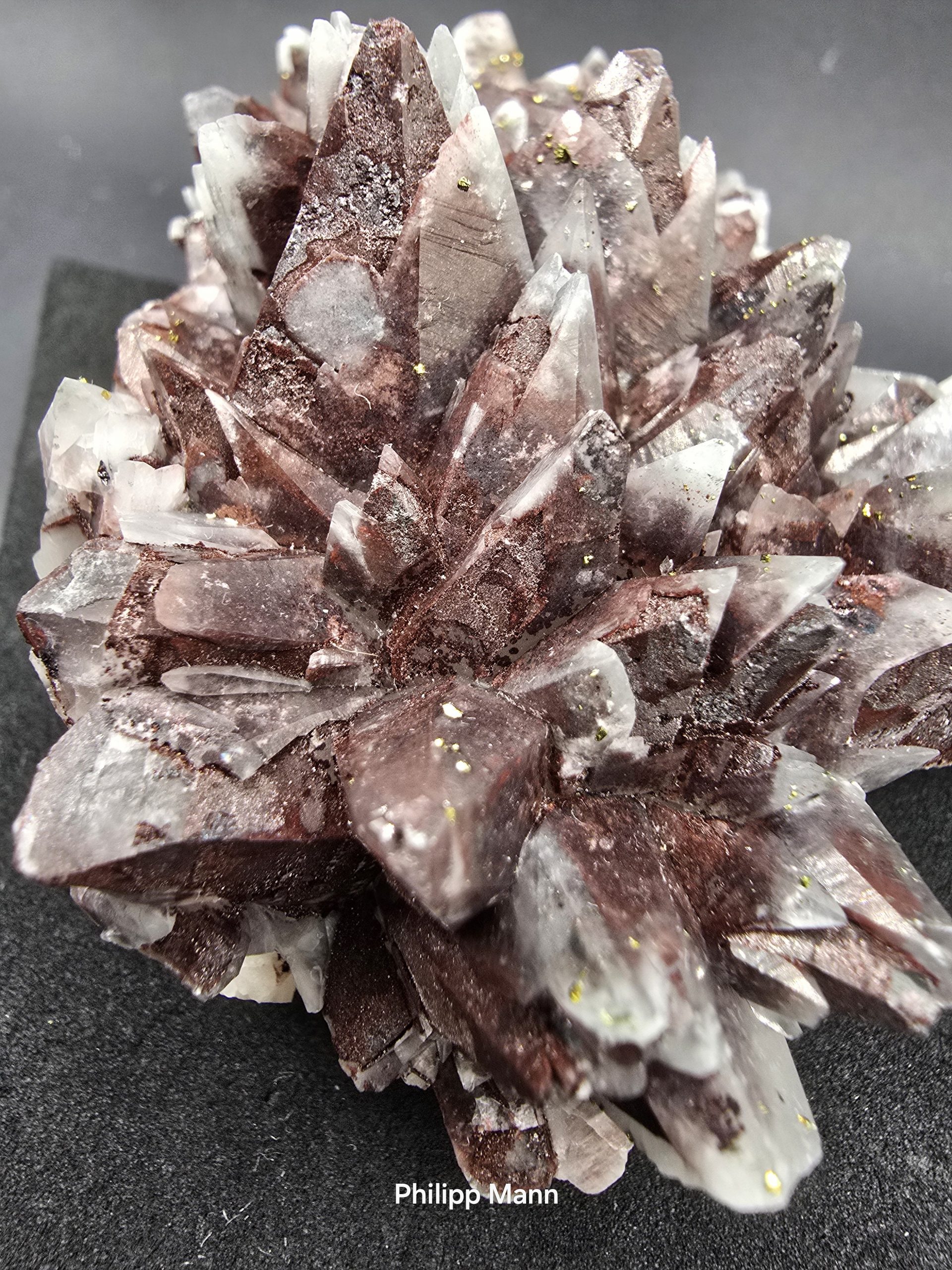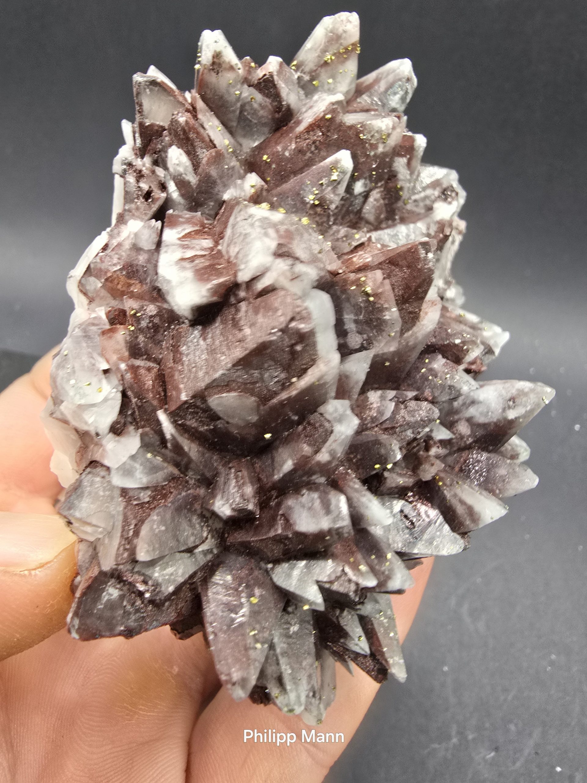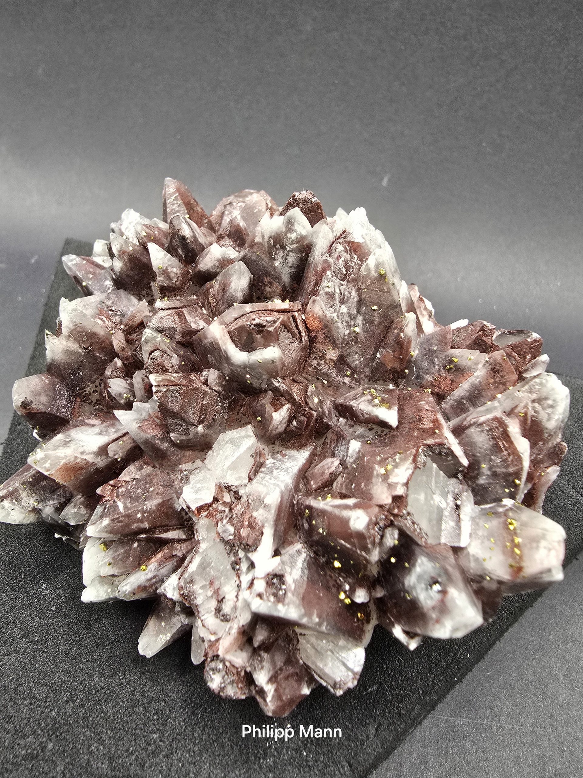 Ein Calcit aus Schlema, Erzgebirge mit schimmernden Hämatit- und Pyriteinschlüssen. Großartig für Sammler!