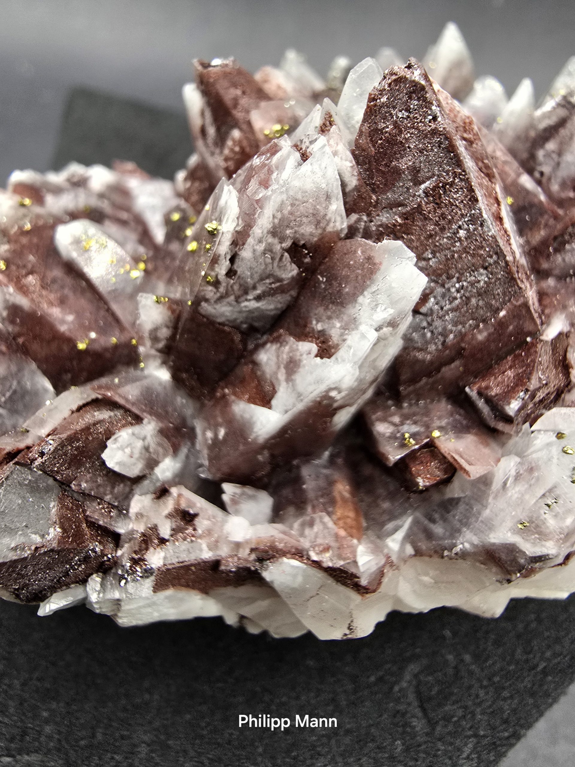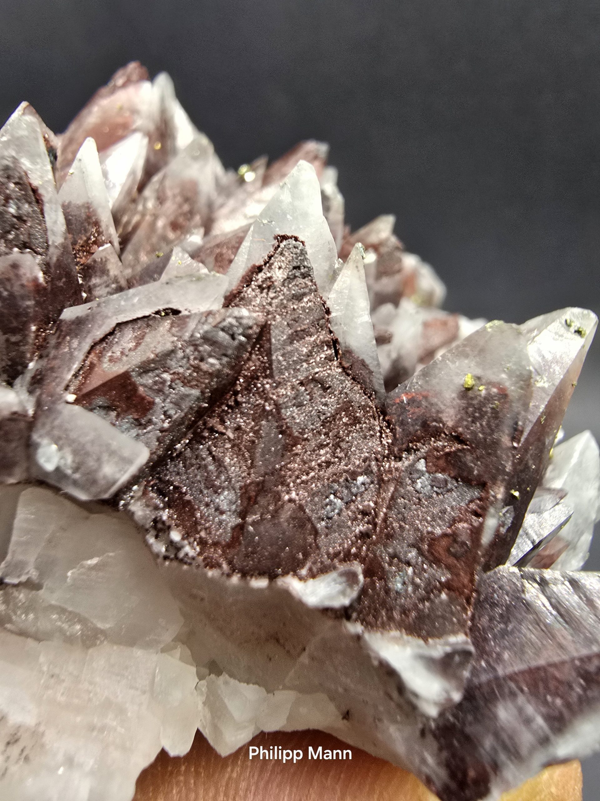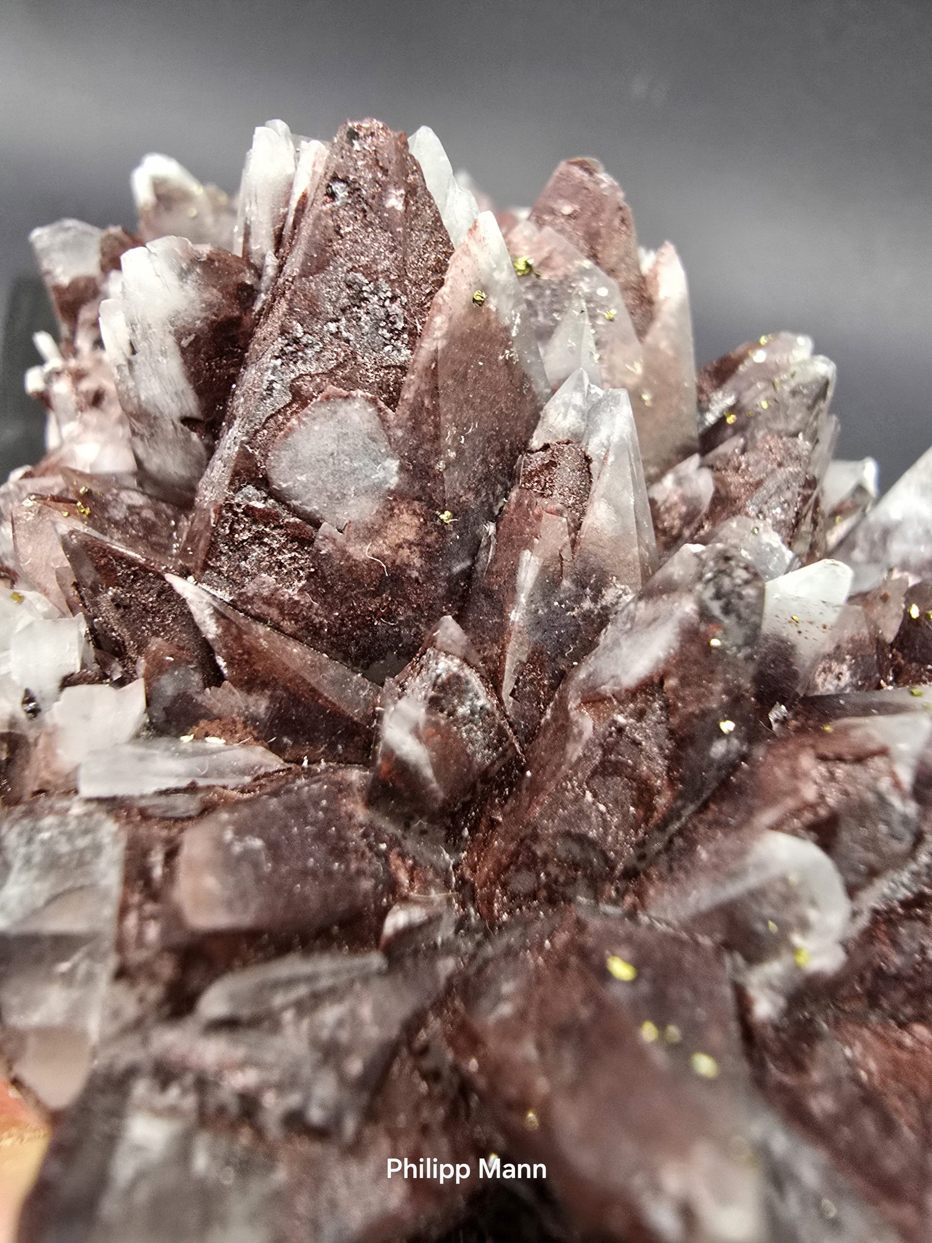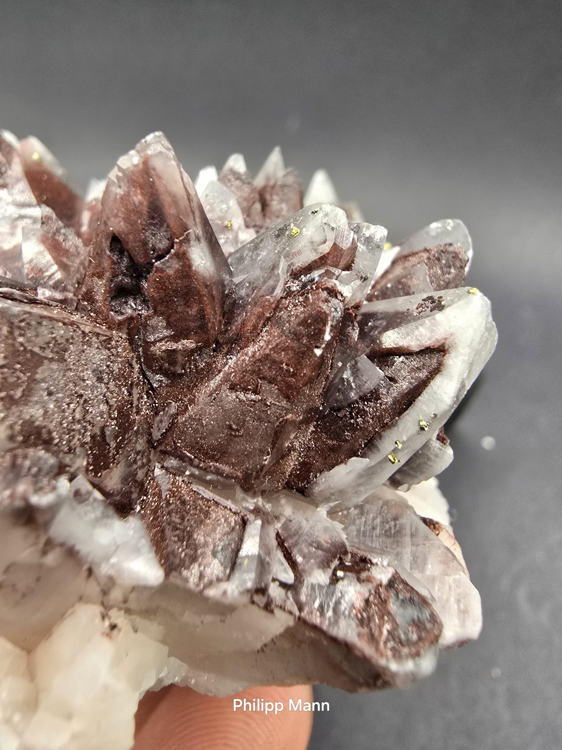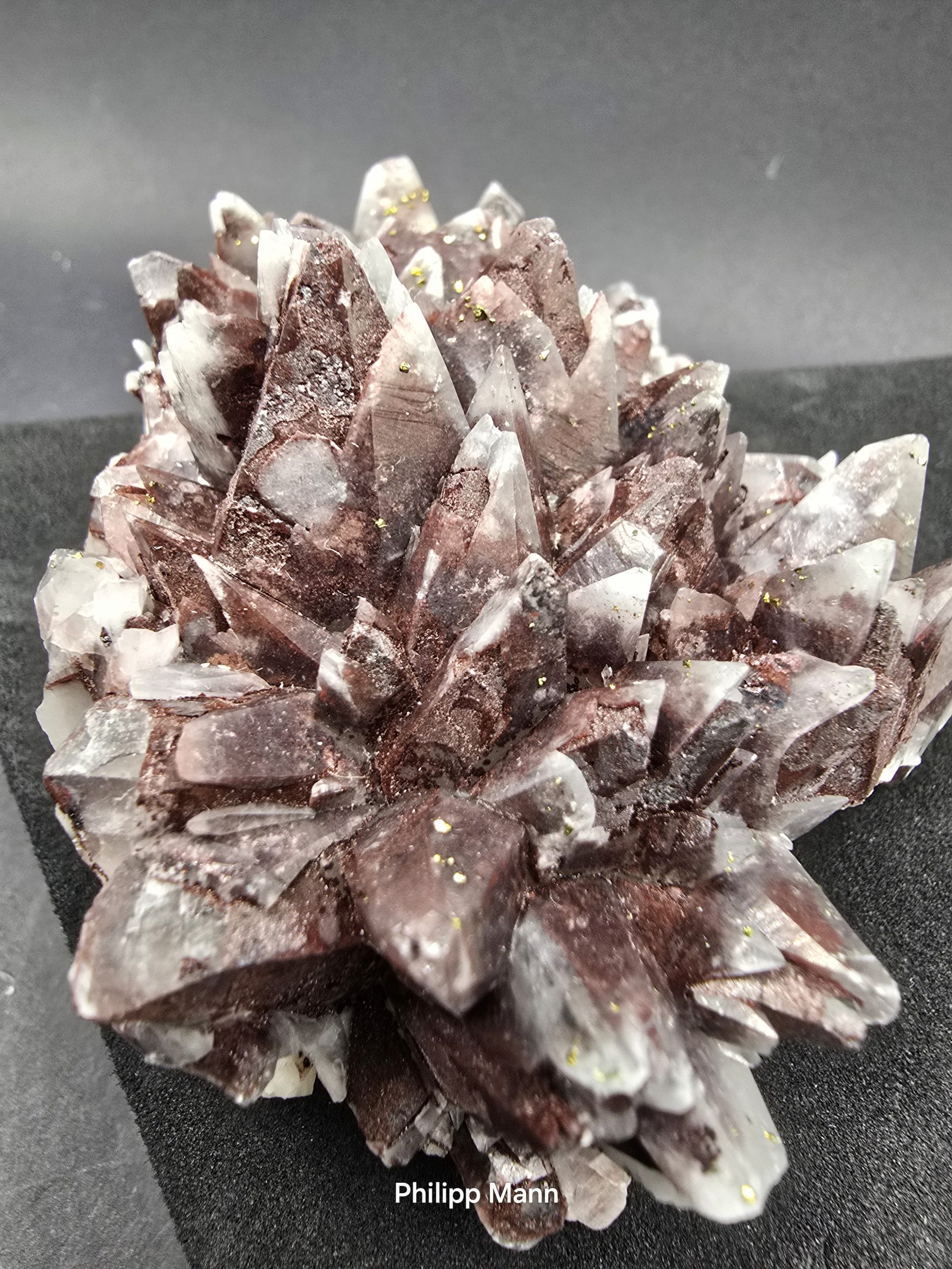 Ein Calcit aus Schlema, Erzgebirge mit schimmernden Hämatit- und Pyriteinschlüssen. Großartig für Sammler!
