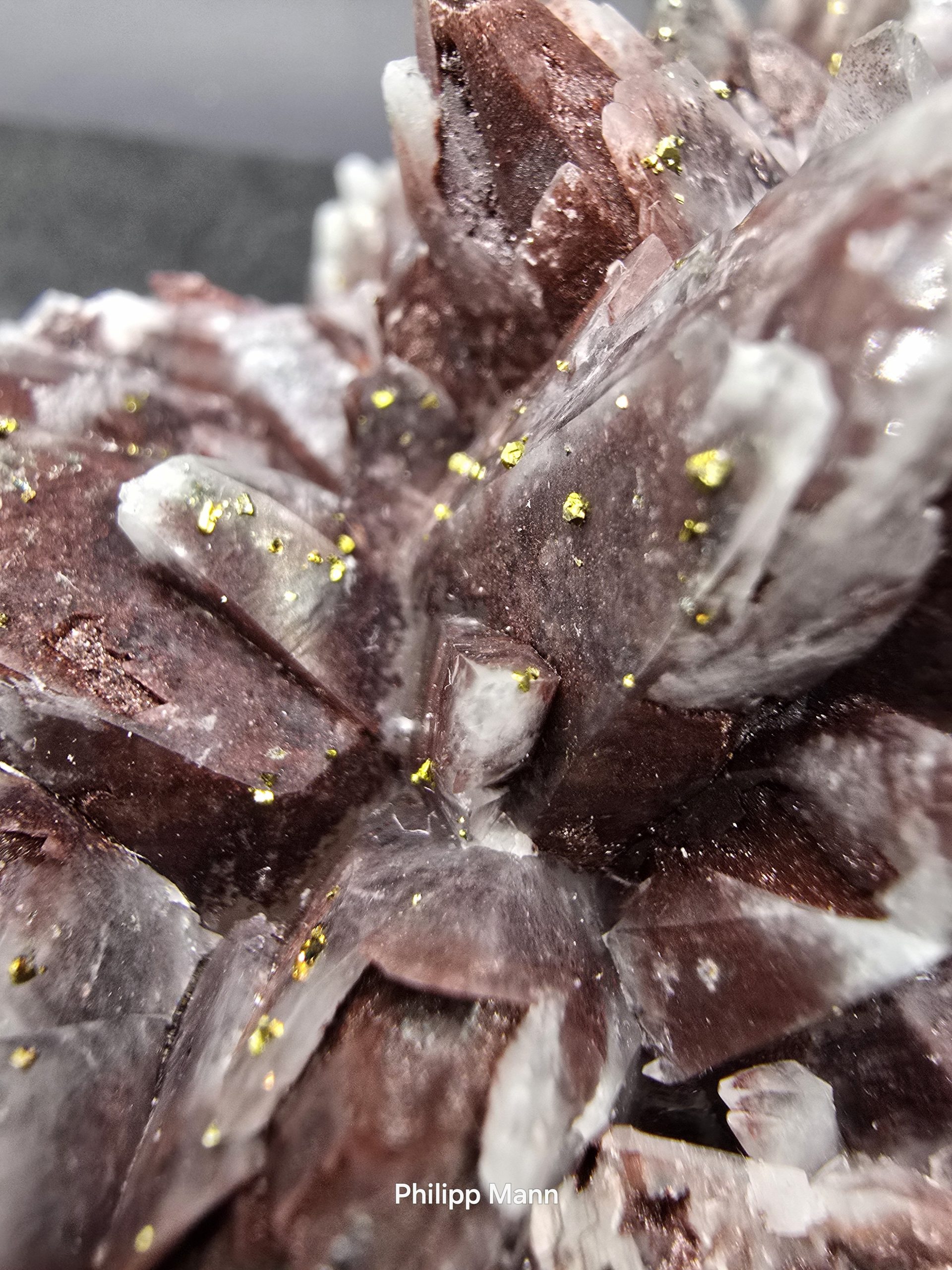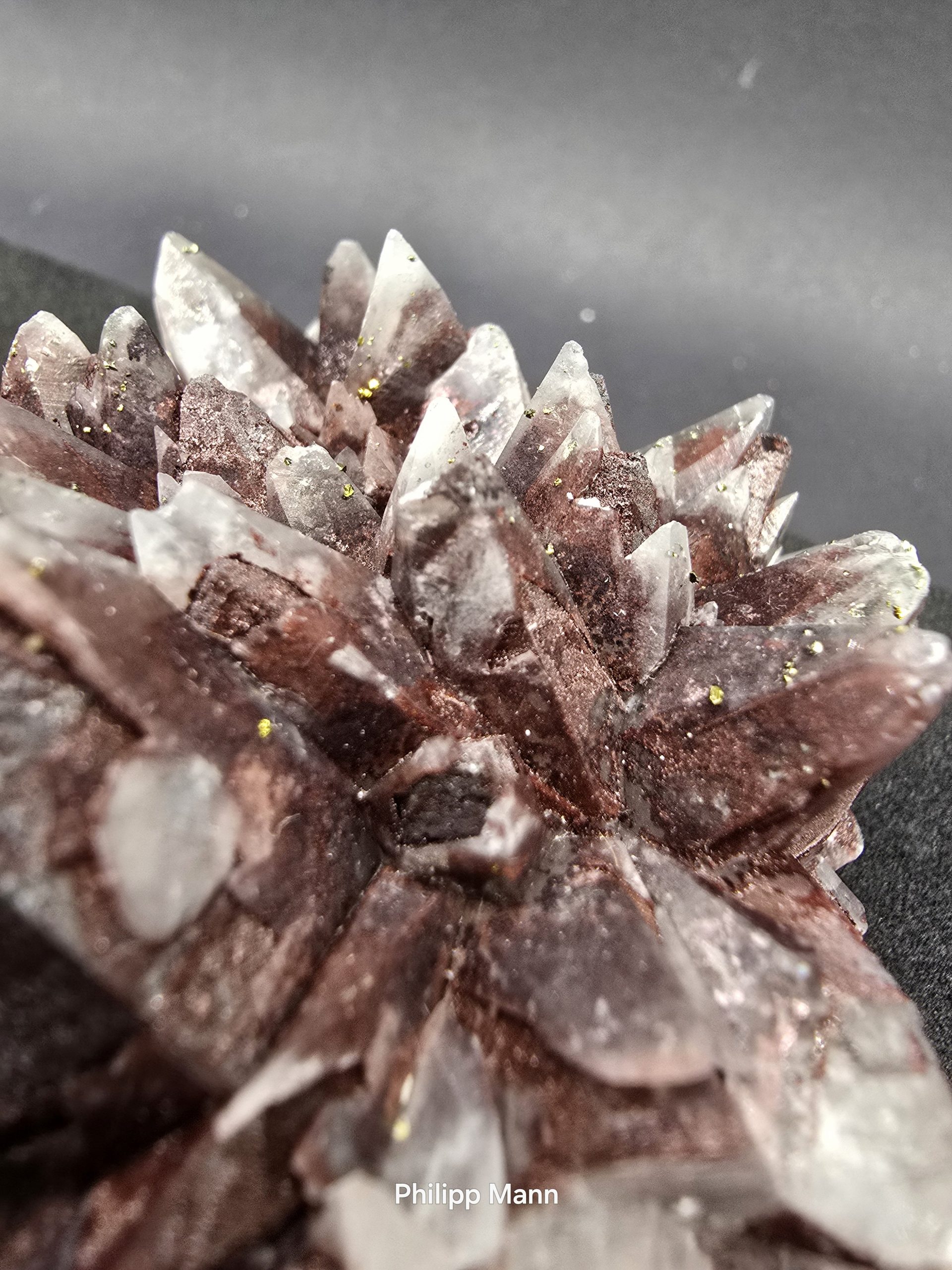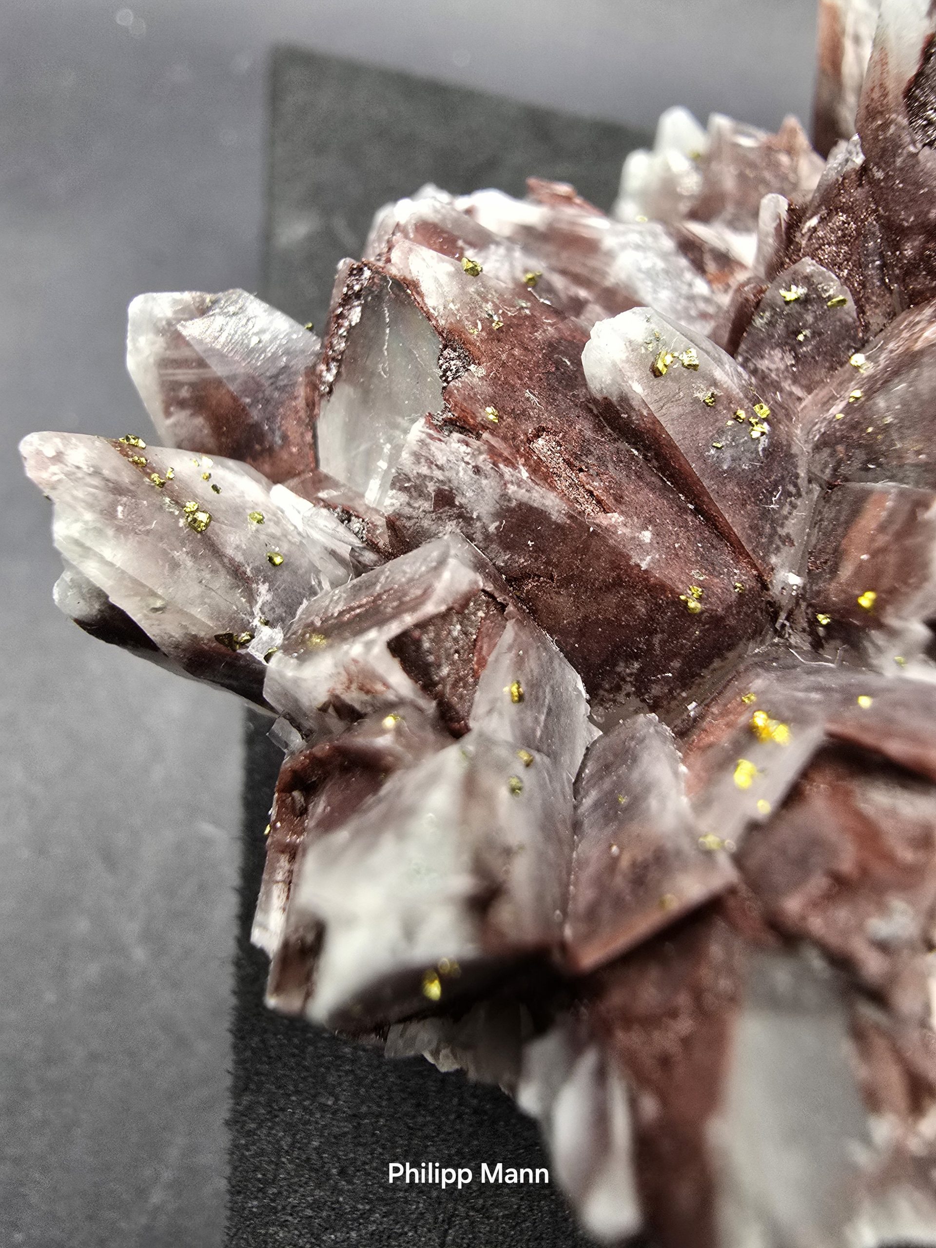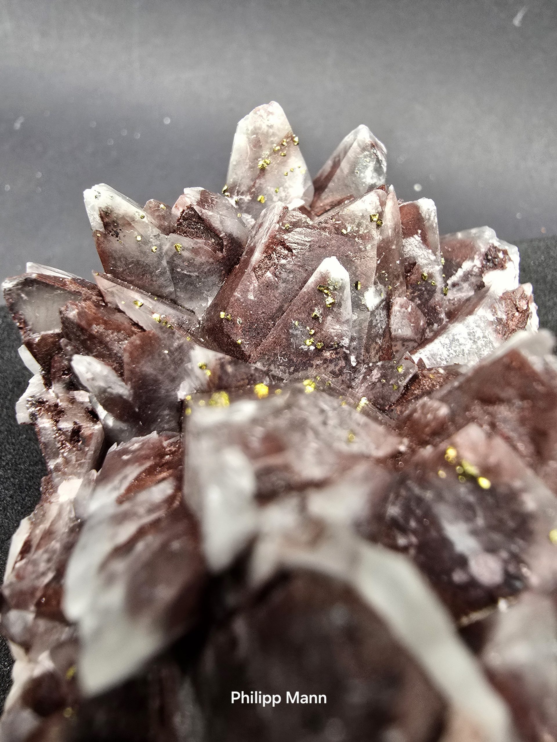 Ein Calcit aus Schlema, Erzgebirge mit schimmernden Hämatit- und Pyriteinschlüssen. Großartig für Sammler!