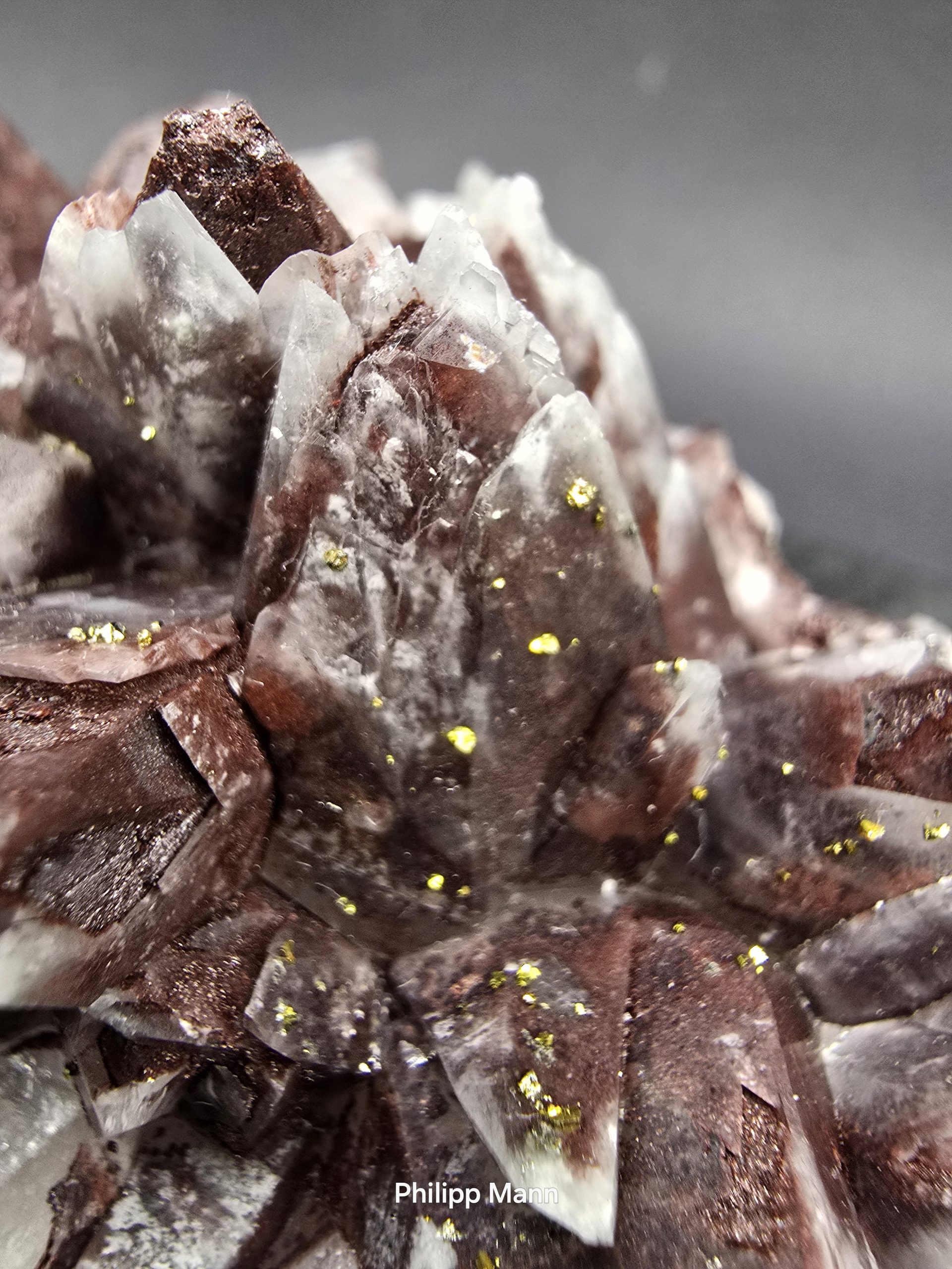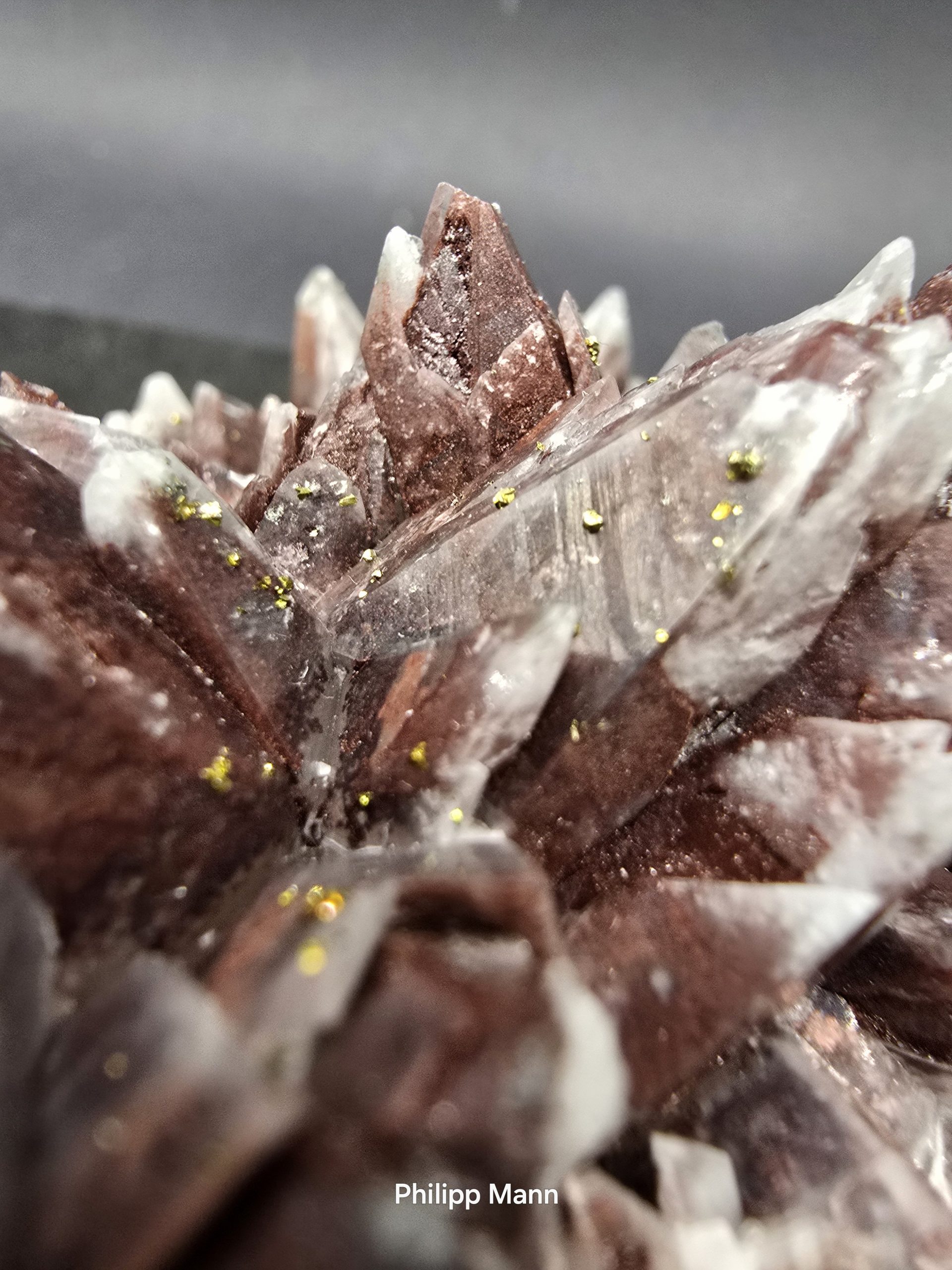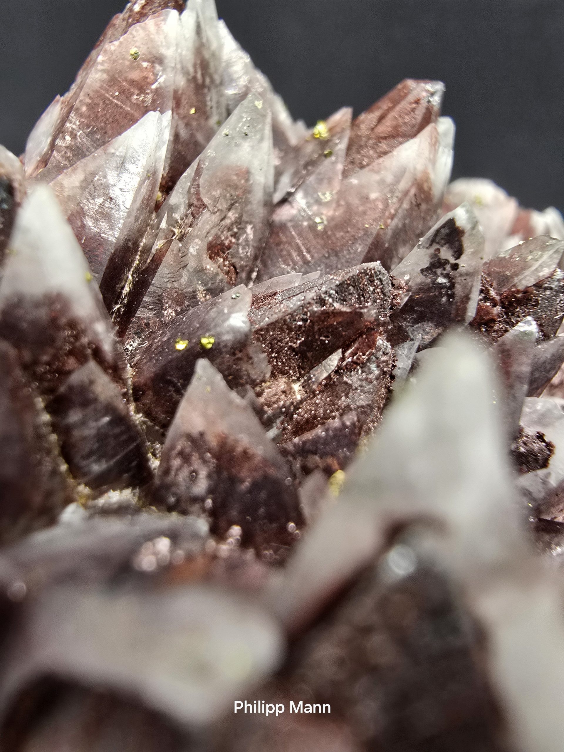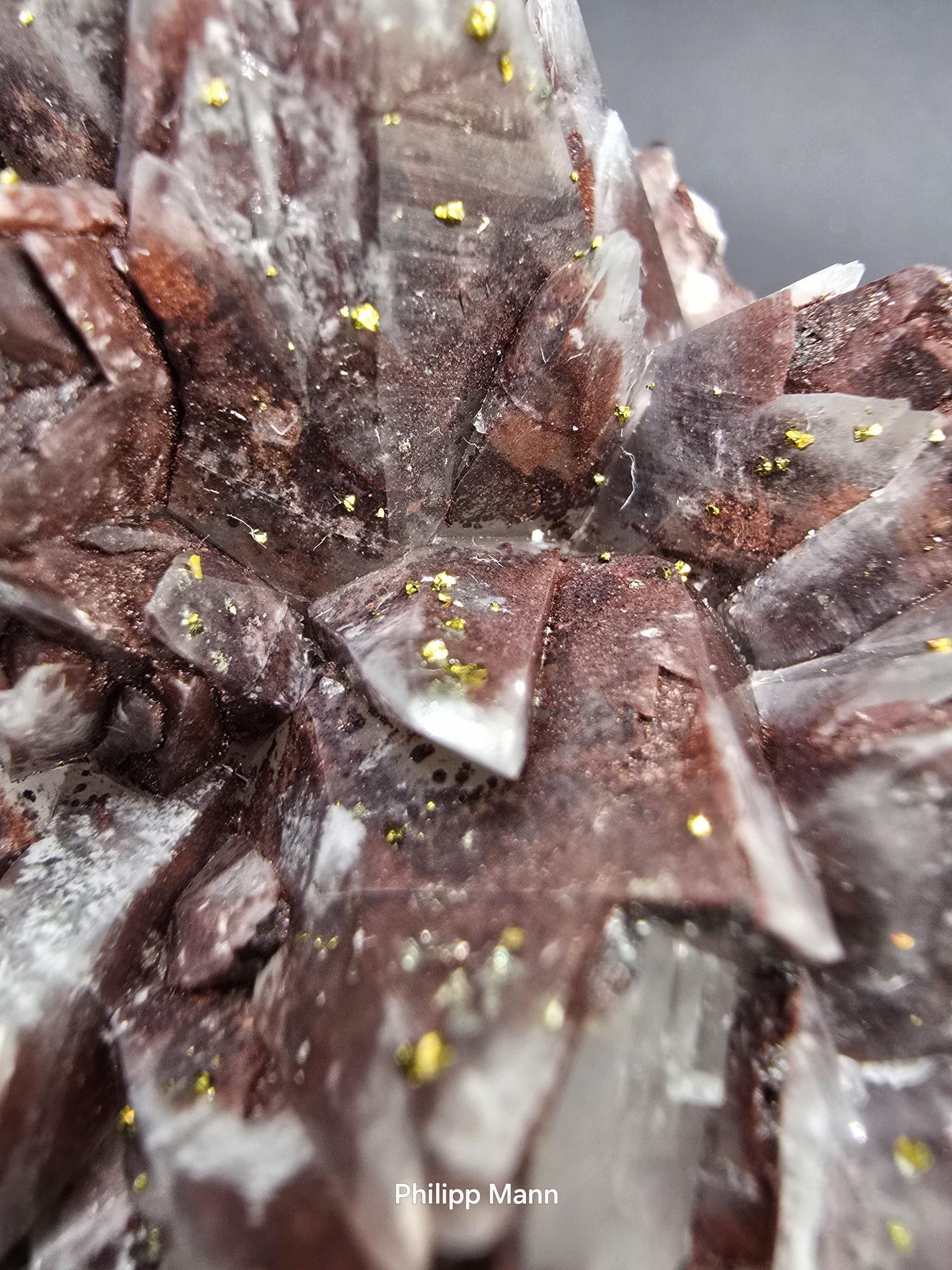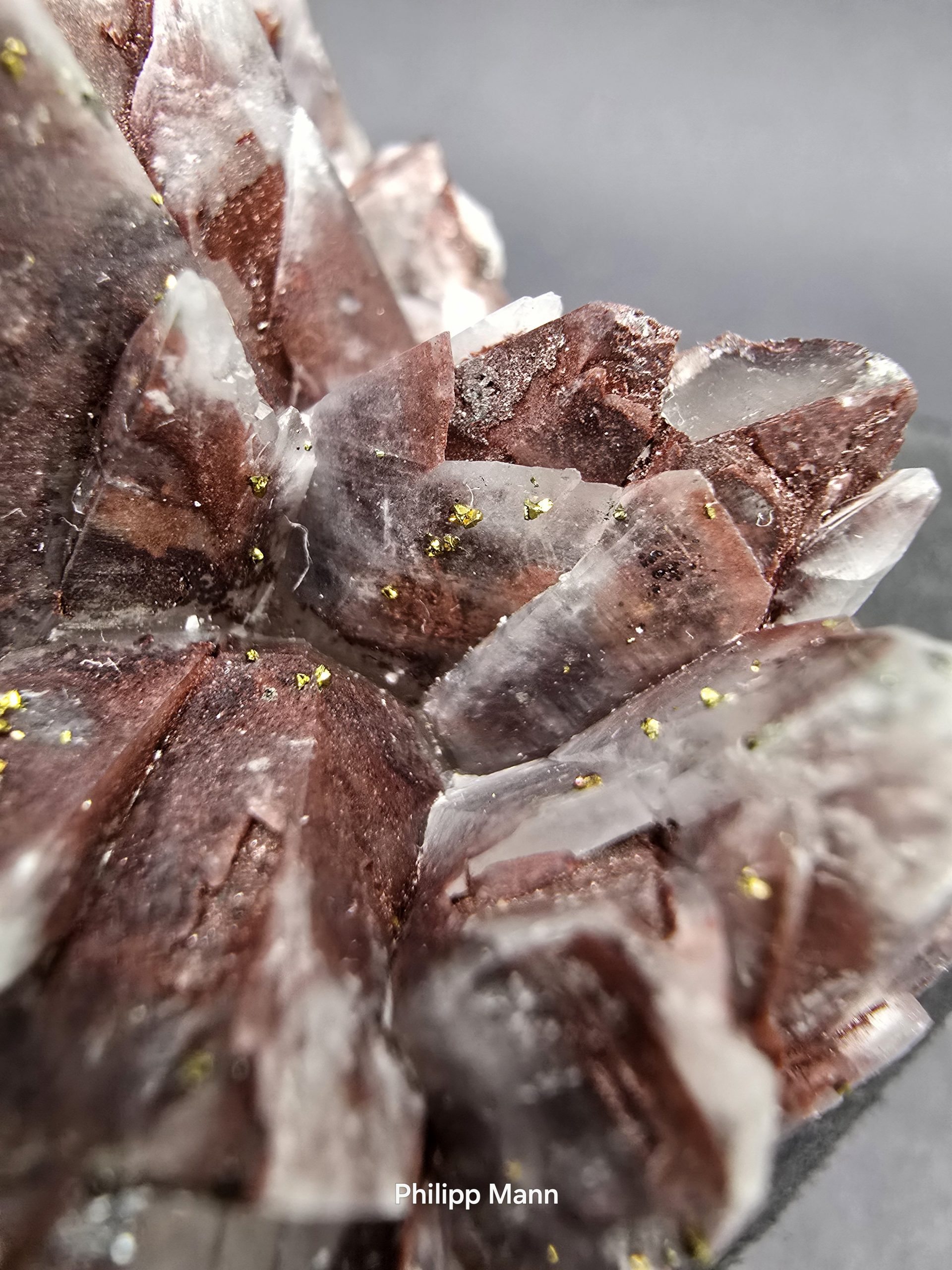 Ein Calcit aus Schlema, Erzgebirge mit schimmernden Hämatit- und Pyriteinschlüssen. Großartig für Sammler!