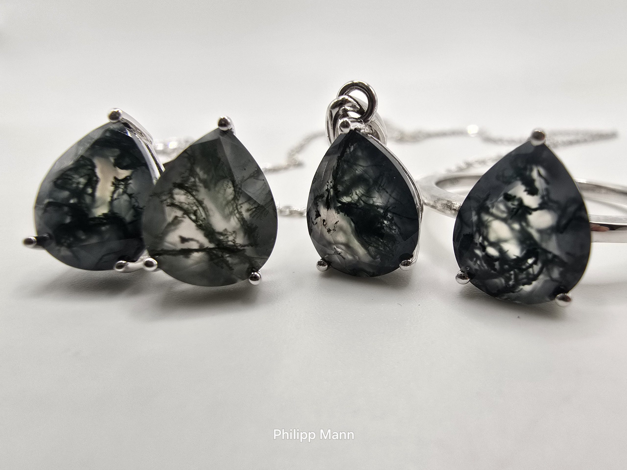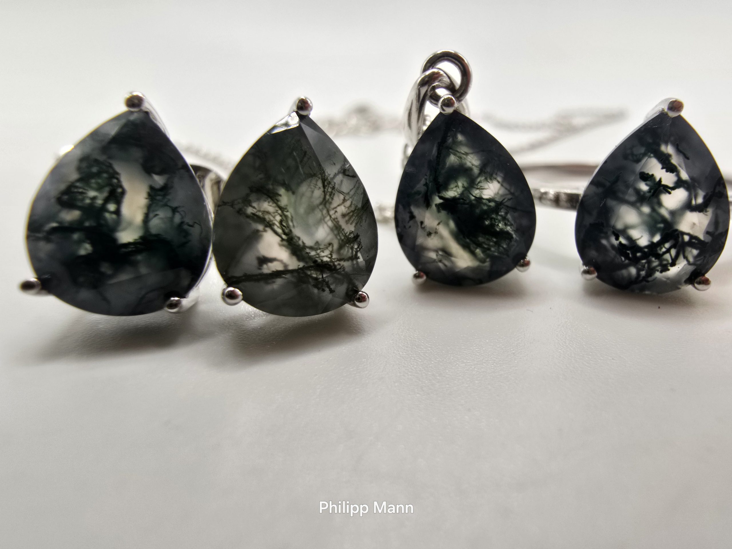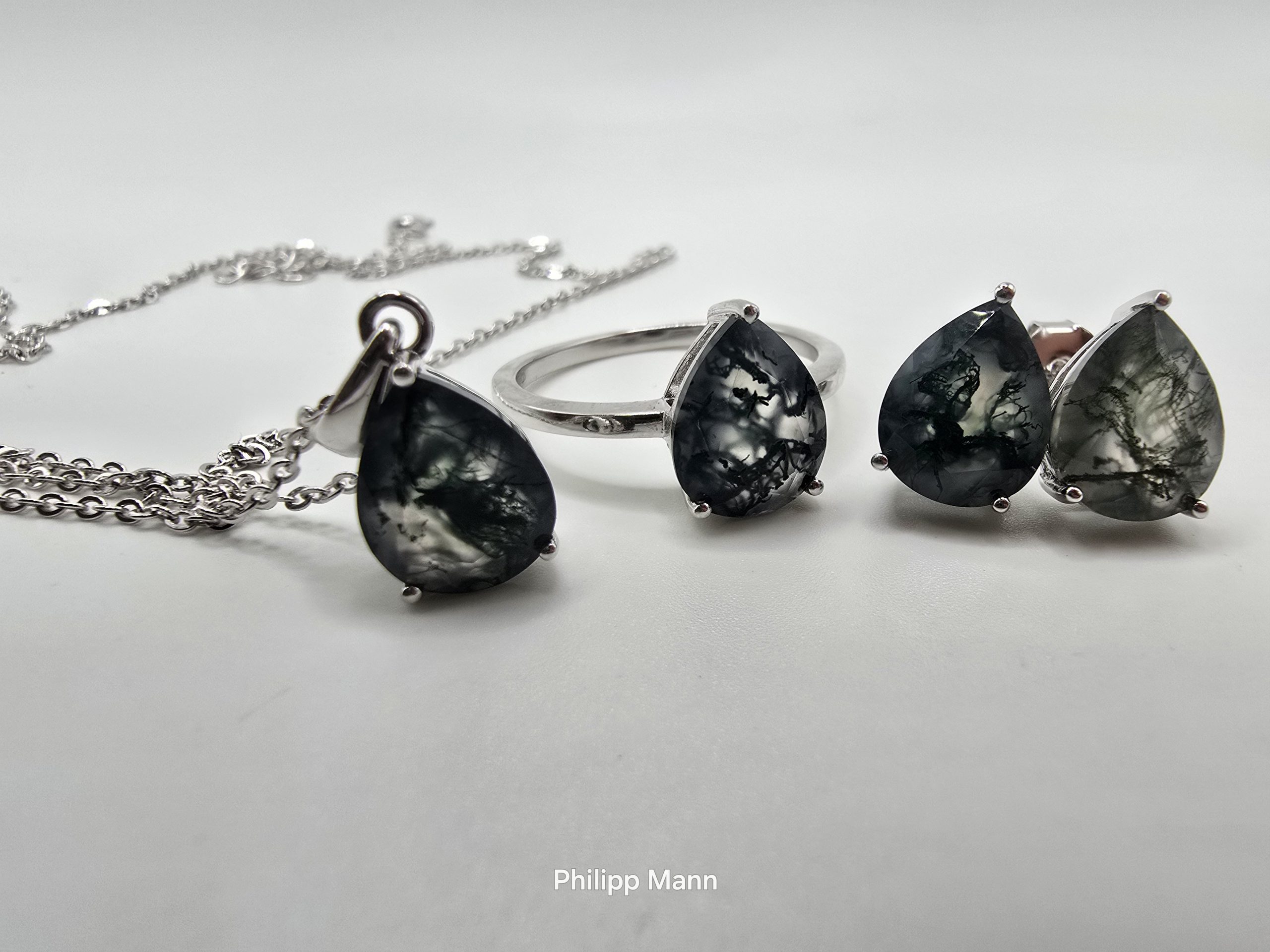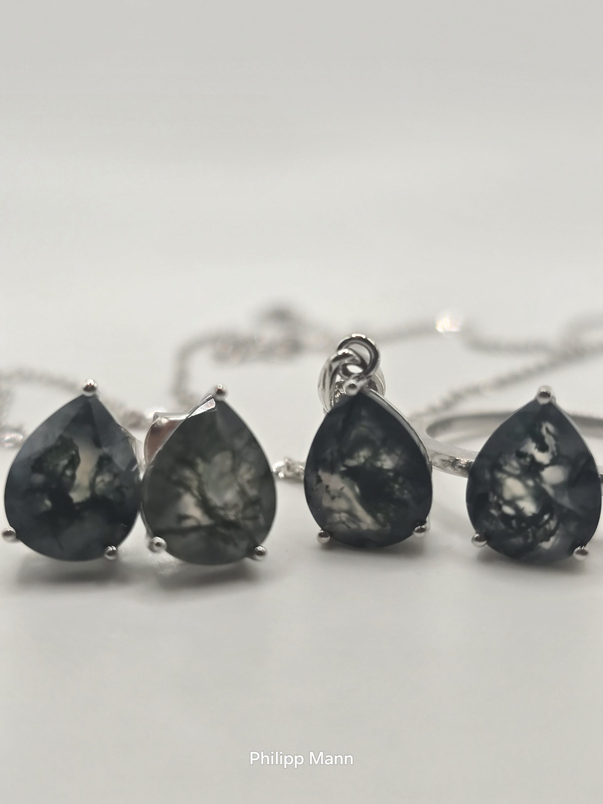 Exquisit und edel: Schmuckset aus 925 Sterling Silber mit Moosachat. Enthält Ohrstecker, Ring (Größe 8) und Halskette mit Anhänger.