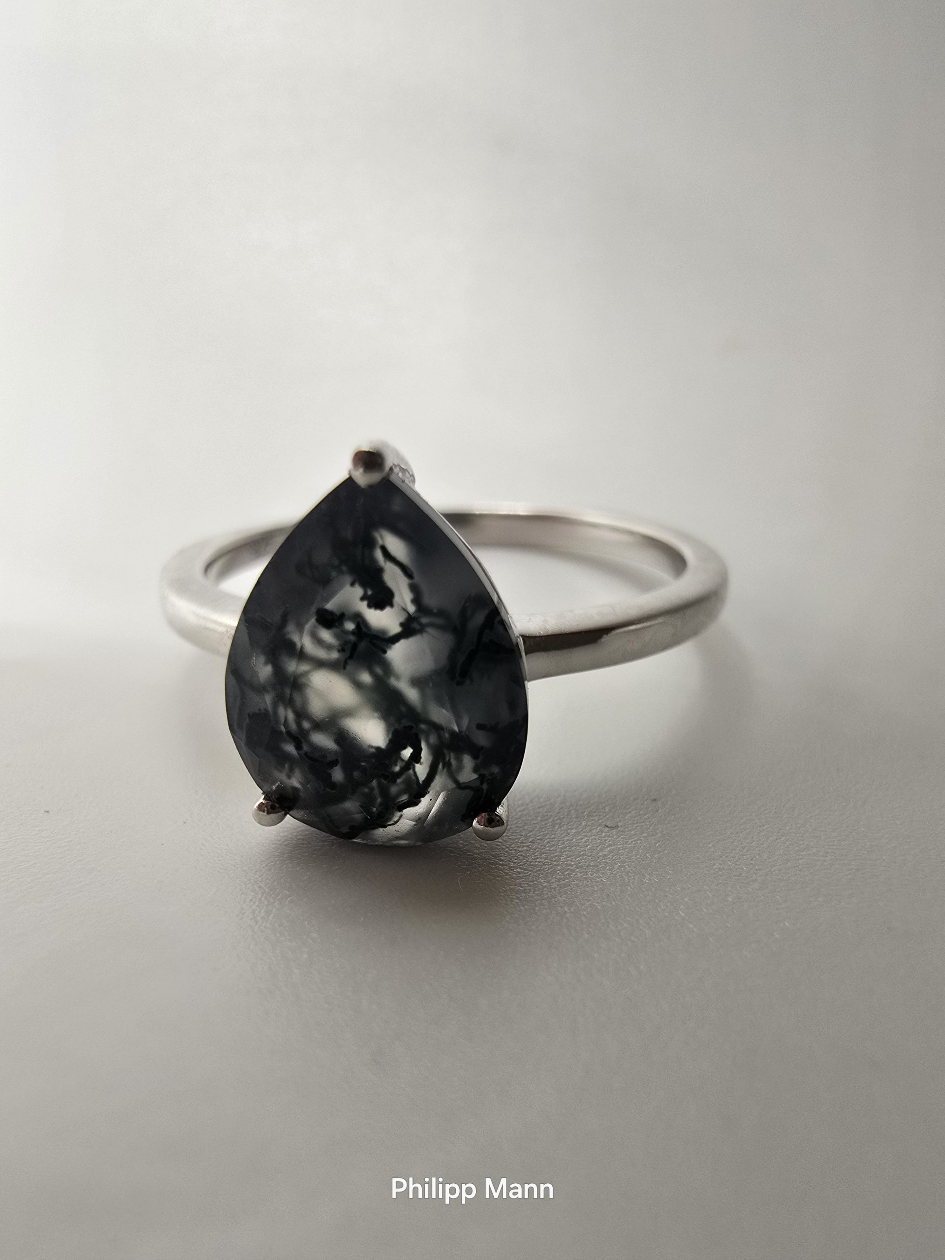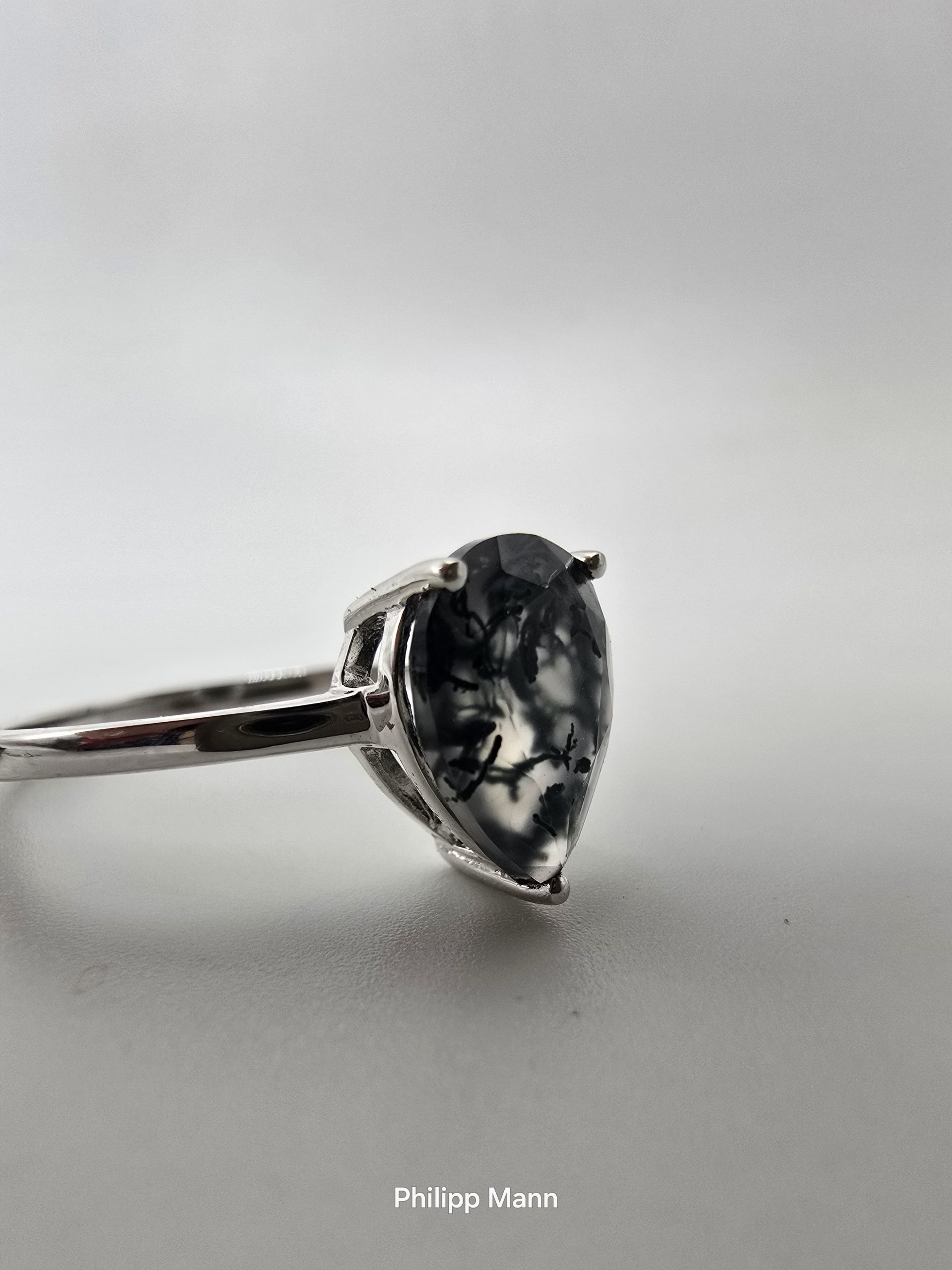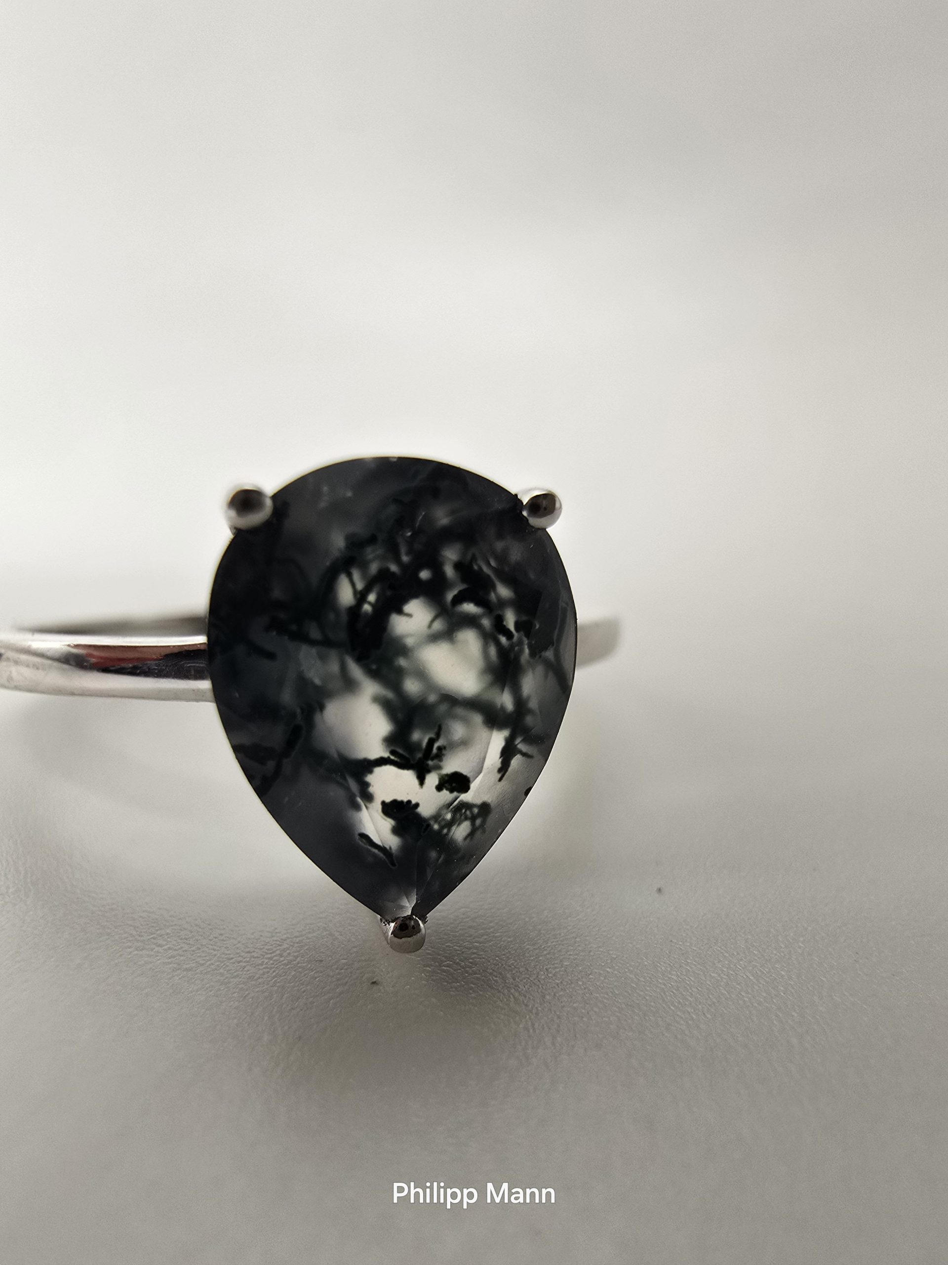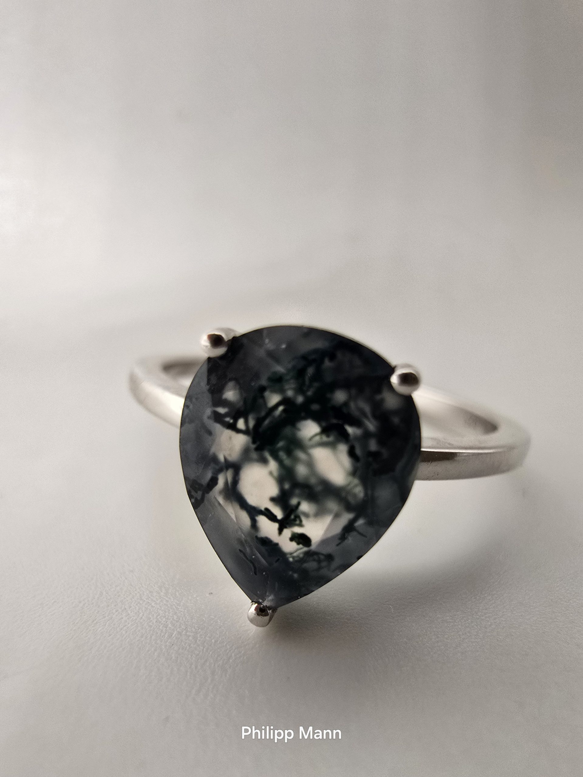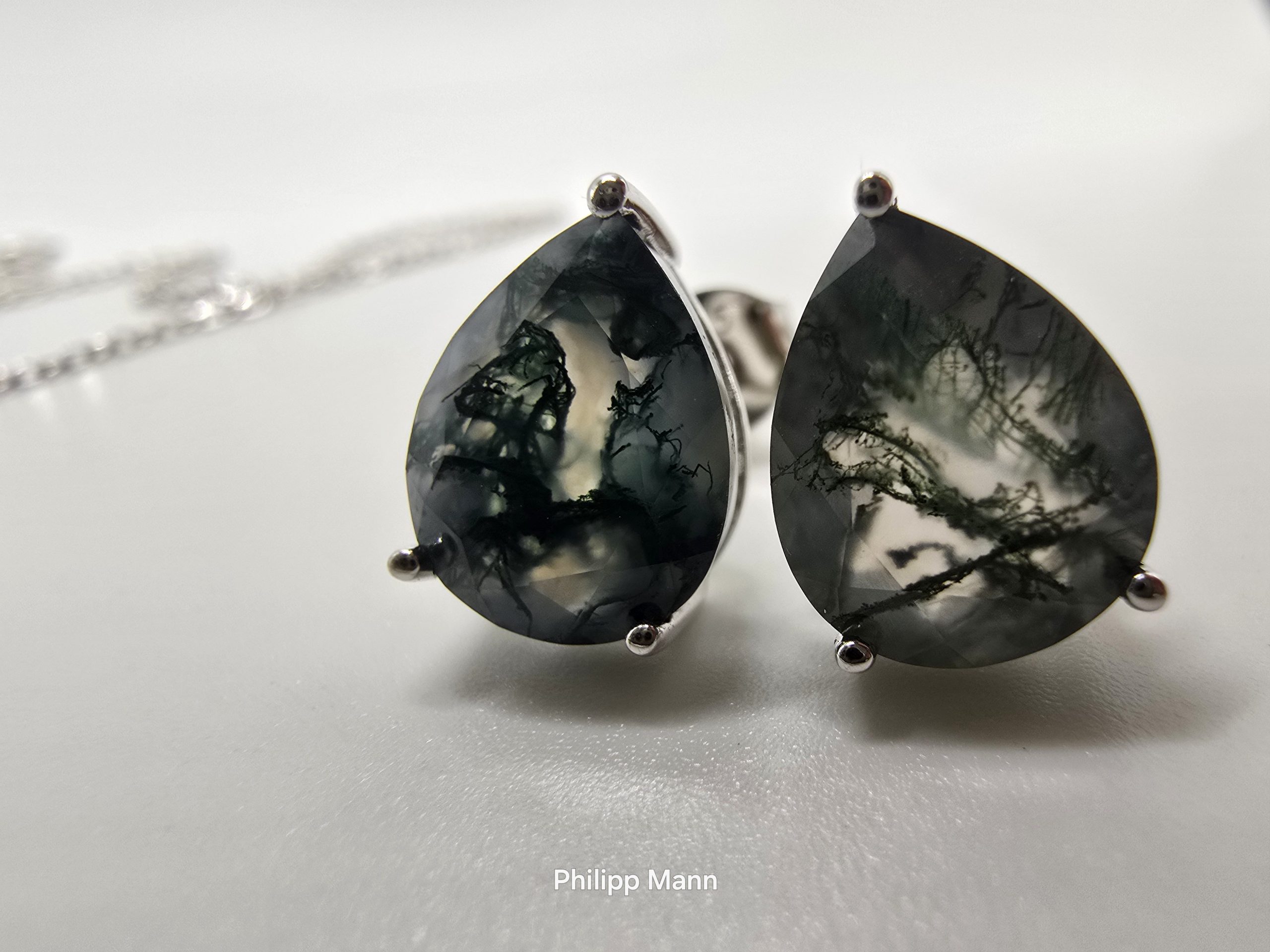 Exquisit und edel: Schmuckset aus 925 Sterling Silber mit Moosachat. Enthält Ohrstecker, Ring (Größe 8) und Halskette mit Anhänger.