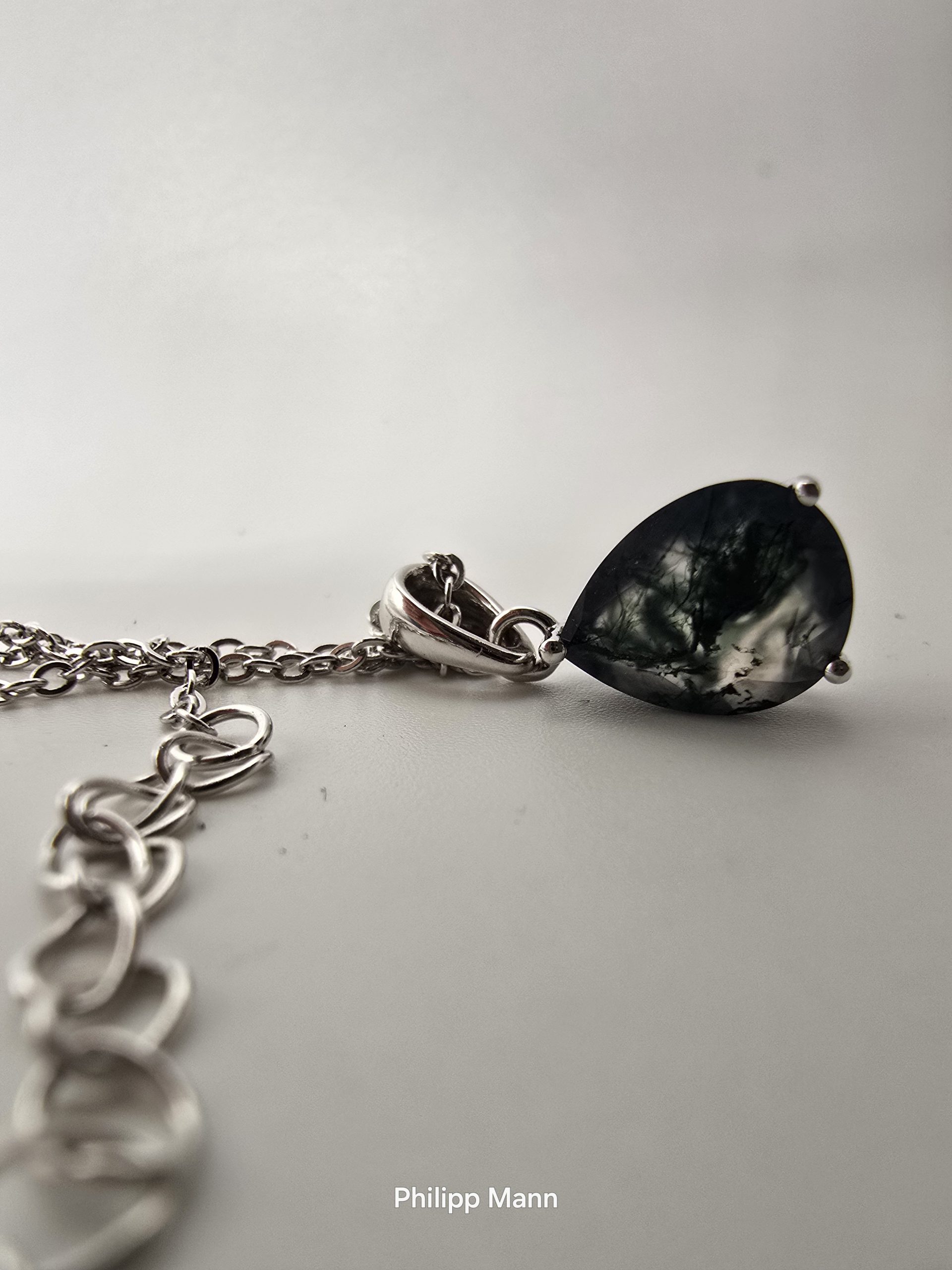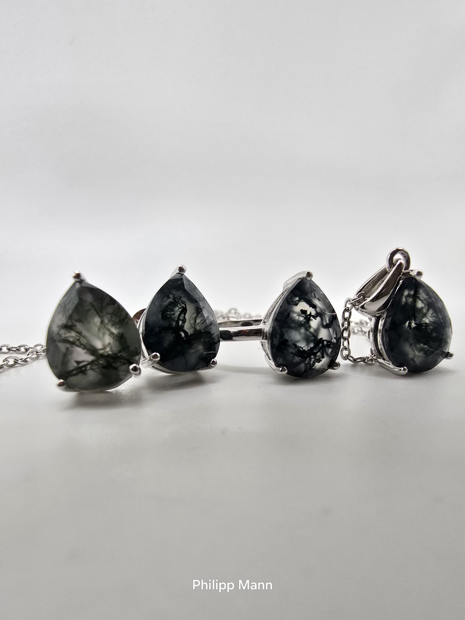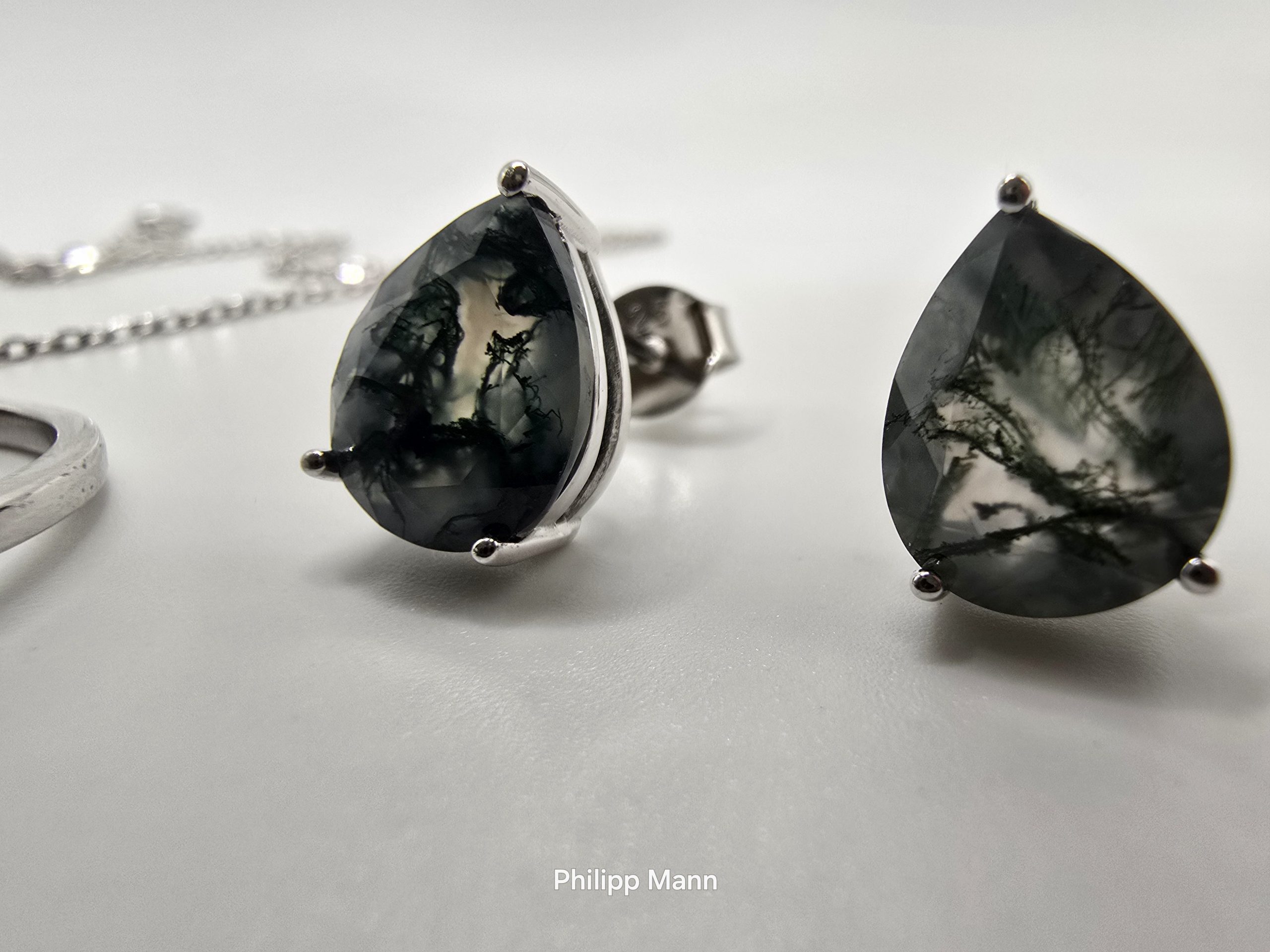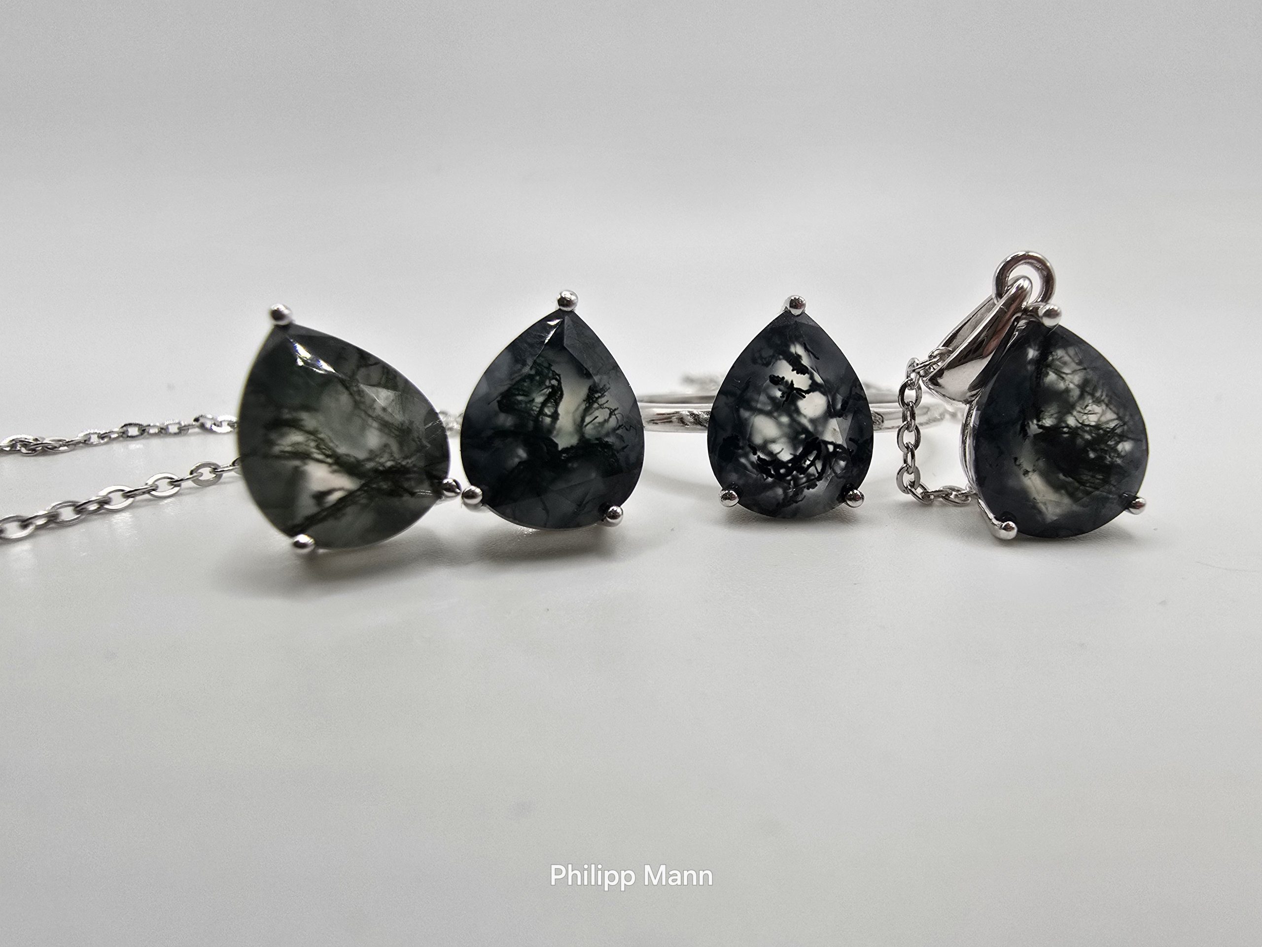 Gönnen Sie sich oder jemand Besonderem dieses exklusive Schmuckset aus 925 Sterling Silber mit edlem Moosachat. Das Set, bestehend aus Ohrsteckern, einem Ring in Größe 8 und einer Halskette mit Anhänger, kombiniert Qualität mit klassischer Schönheit. Bitte beachten Sie, dass geringe Farbabweichungen je nach Bildschirmeinstellung auftreten können, die den individuellen Charme jedes Stücks verstärken.