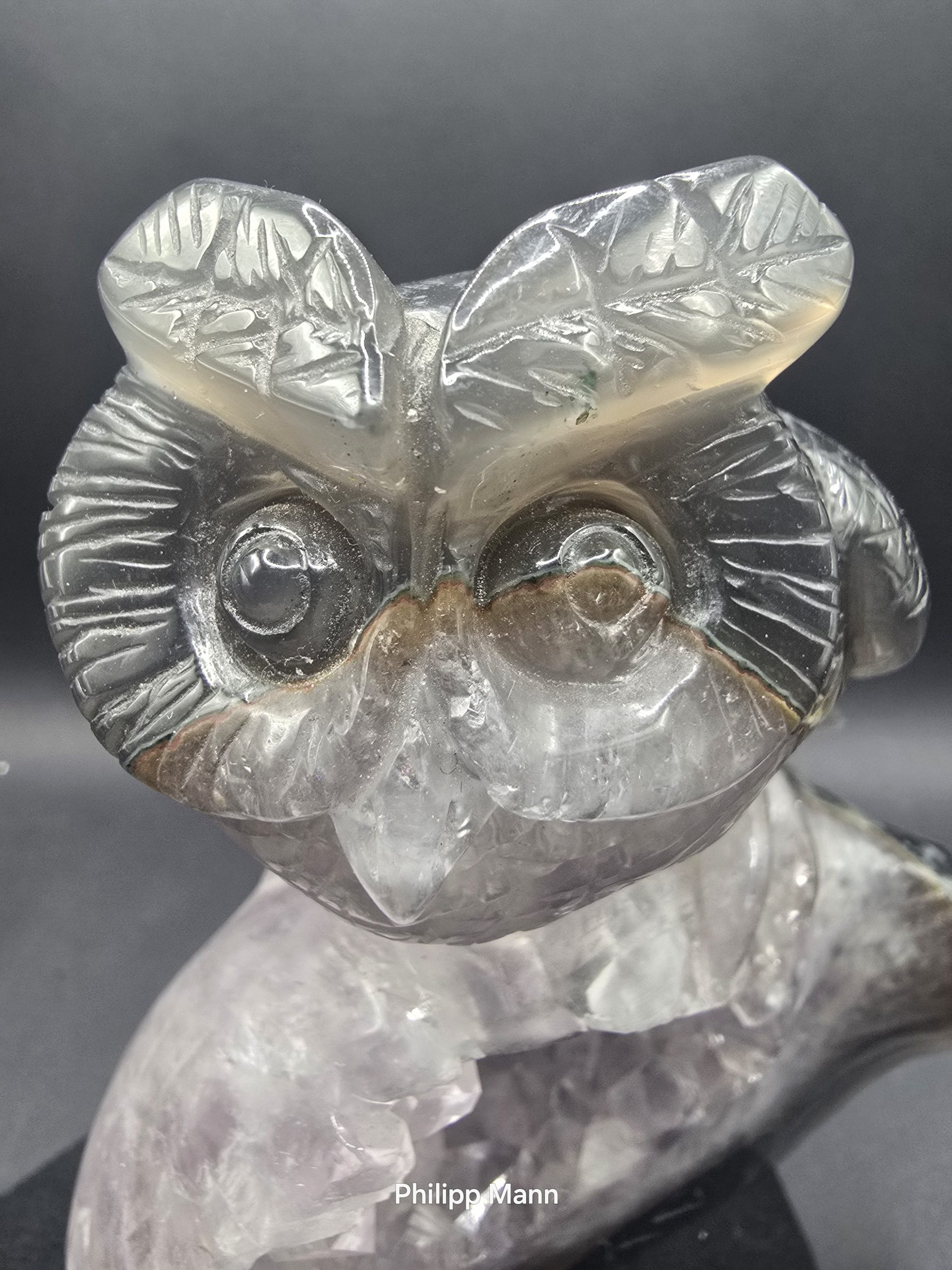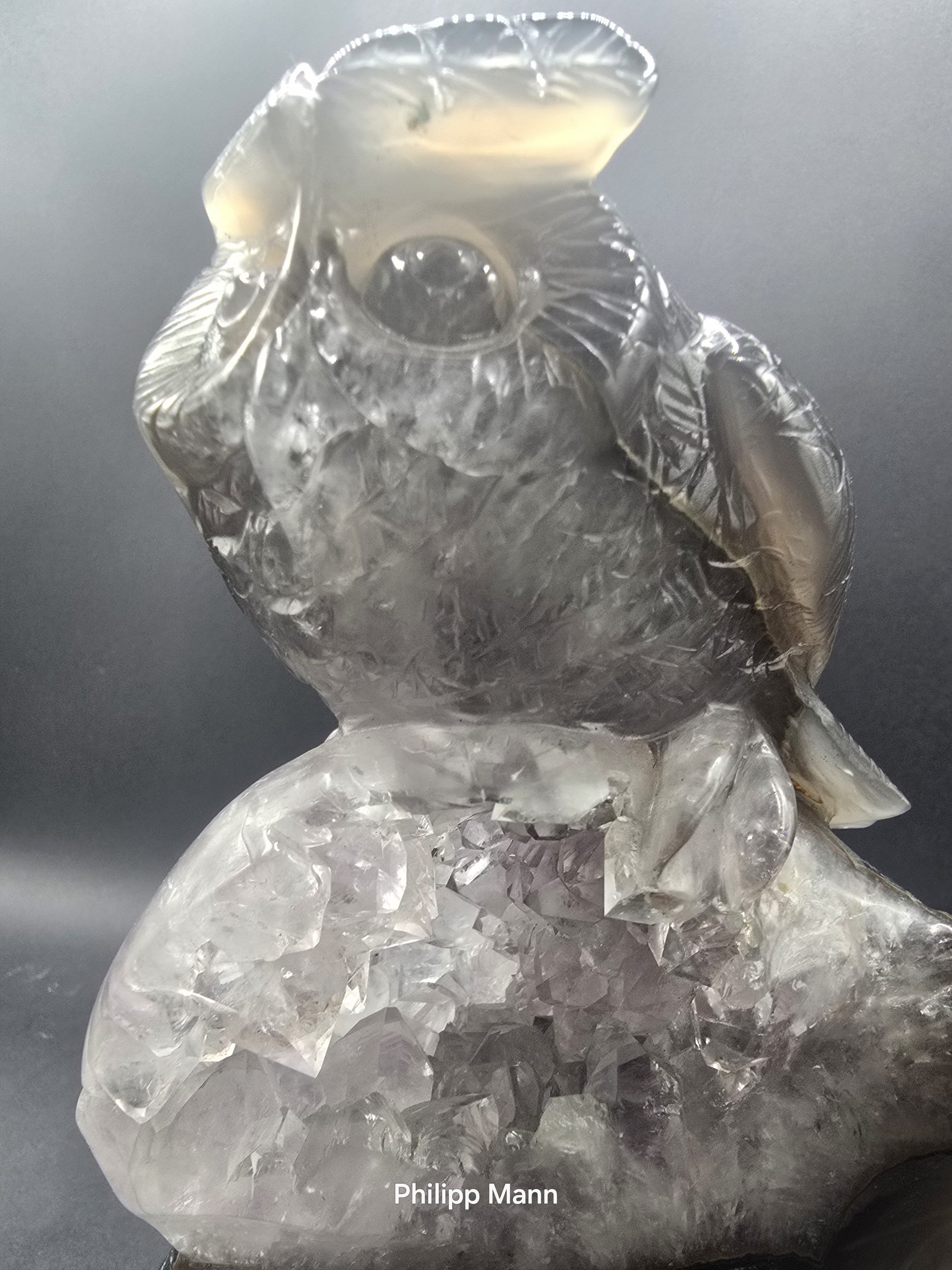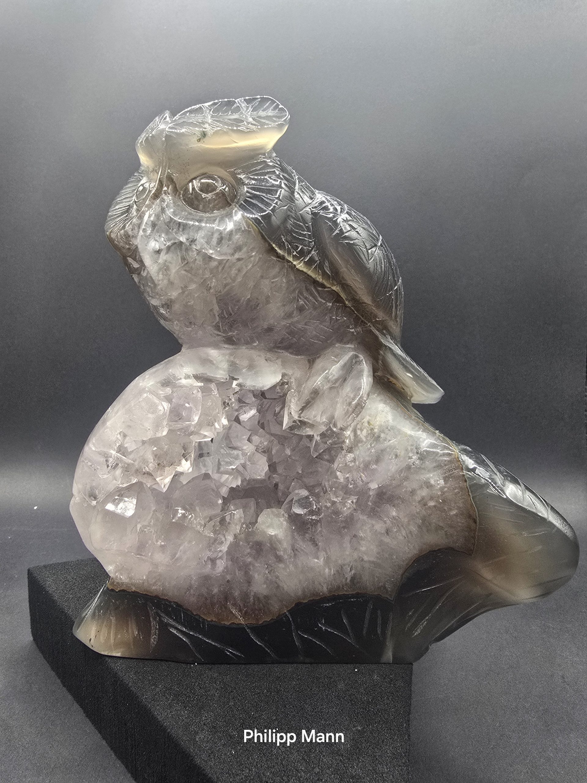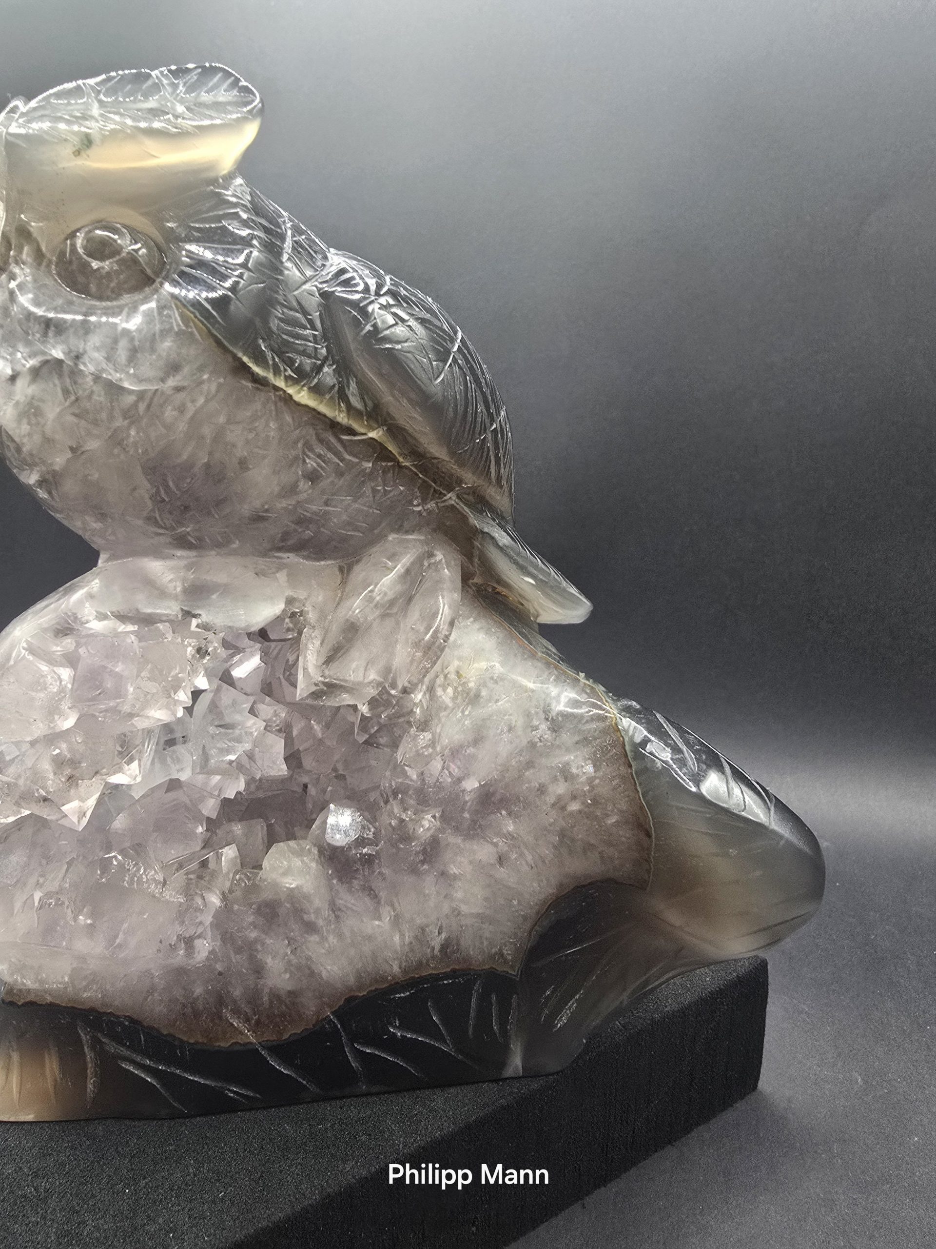 Schnitzkunst trifft Natur: Eule aus Amethyst mit einzigartiger Geodenöffnung – ein echter Blickfang!